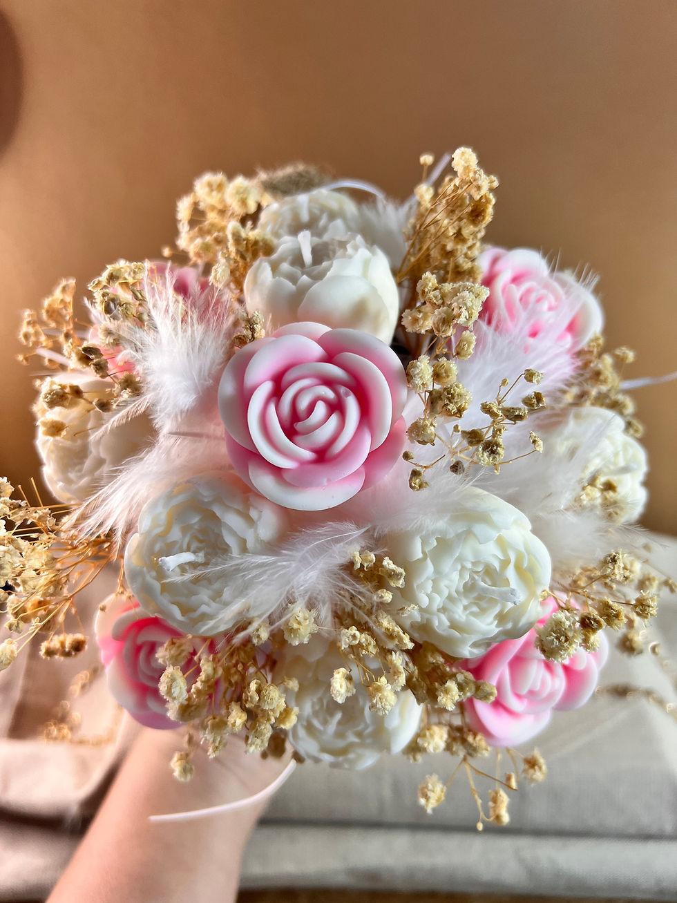 Chaque Bouquet Éternel est une création sur-mesure, confectionnée à partir de cire végétale et enrichie de fragrances exquises provenant de Grasse, la capitale mondiale du parfum. La beauté naturelle du bouquet est rehaussée par des fleurs séchées délicatement choisies, ajoutant une dimension aérienne et épurée à l'ensemble.